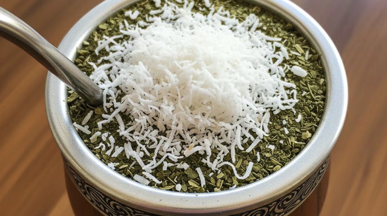 Agregando coco rallado directamente a la yerba.