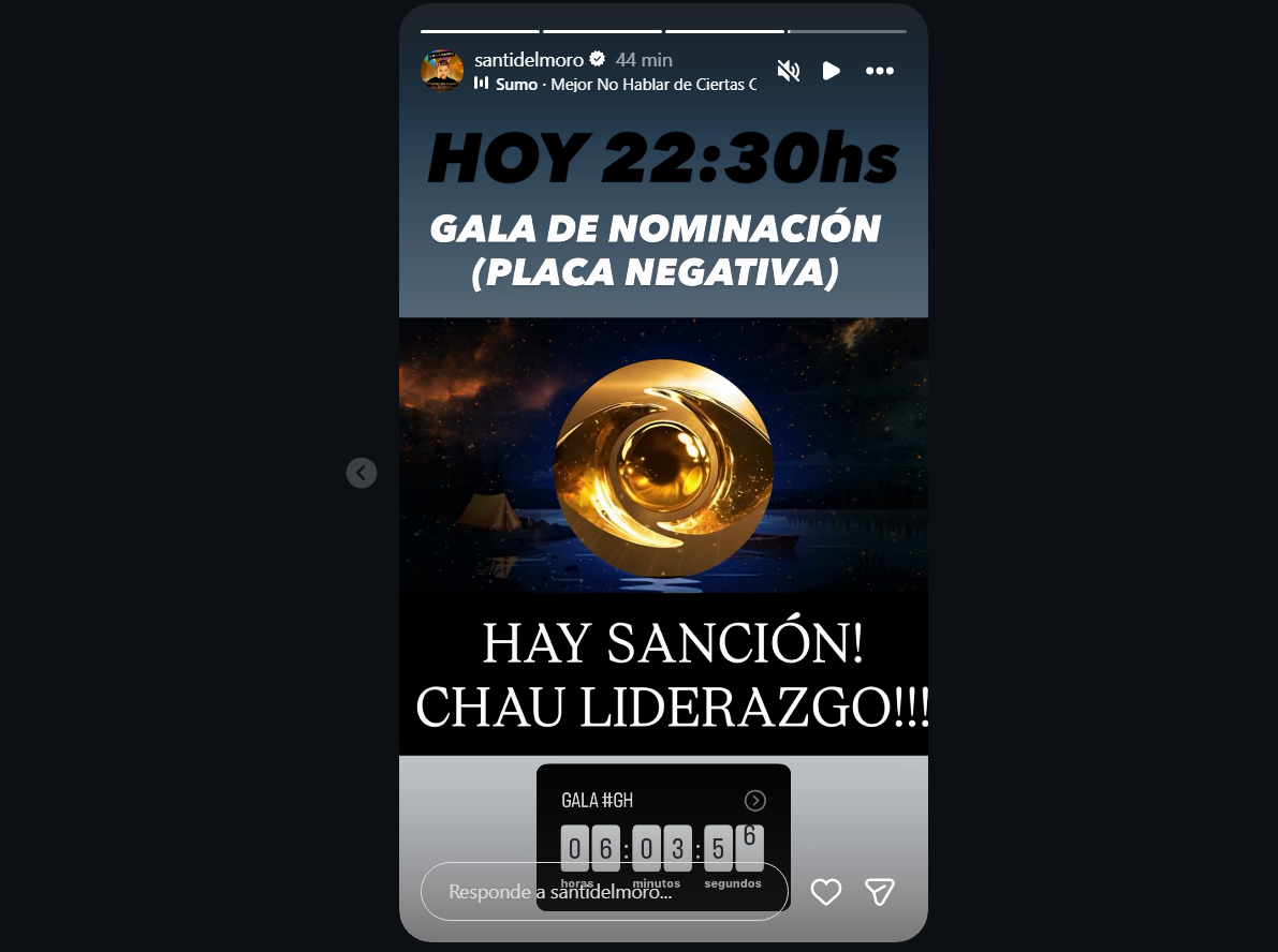 “Hay sanción. Chau liderazgo”, expresó Del Moro a través de sus redes sociales, en un mensaje que generó expectativa entre los seguidores del programa. La decisión final se dará a conocer este martes a las 22:30, durante la gala de nominación.