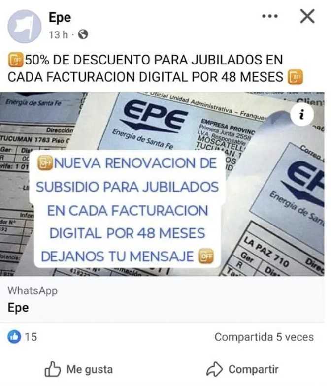 Según informó la empresa, se detectó la difusión de anuncios que prometen un supuesto descuento del 50% en la factura de electricidad para jubilados del Banco Nación, principalmente a través de plataformas como Facebook. Estas publicaciones forman parte de una maniobra de estafa digital.