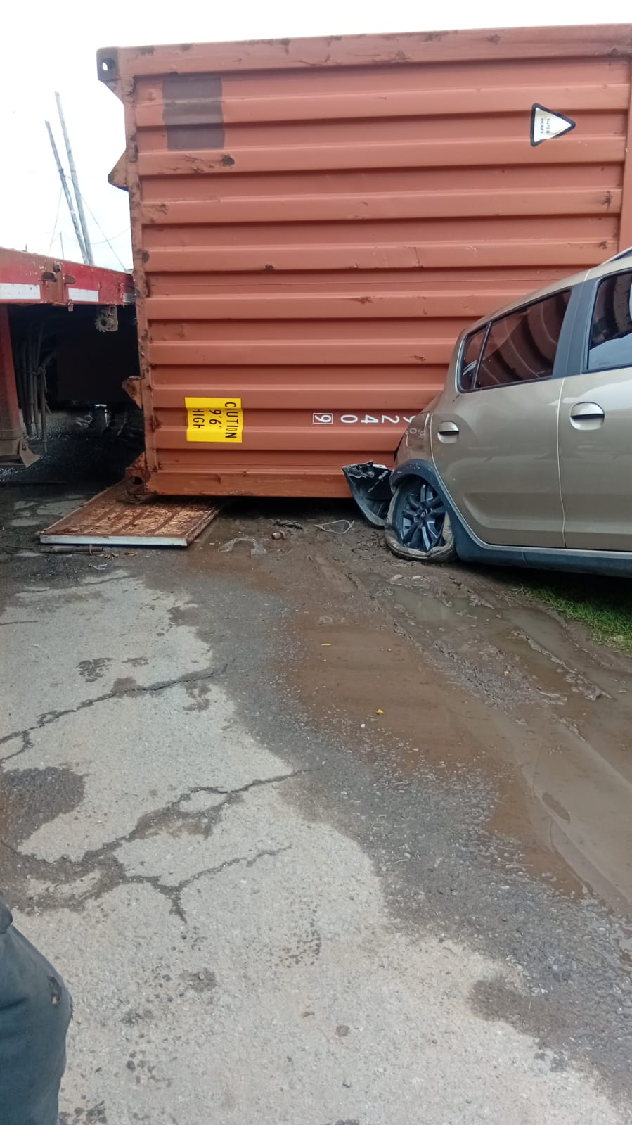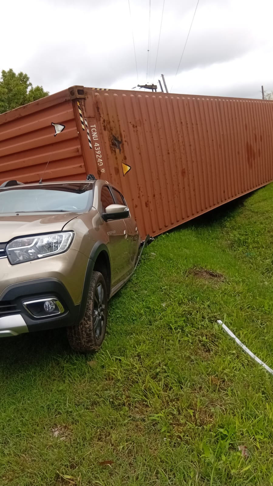 En la intersección de Camino Viejo a Soldini y Biarritz, (barrio Puente Gallego) un camión que transportaba un contenedor perdió estabilidad al encastrarse en el barro acumulado en la zona, mordió la zanja y terminó volcando sobre un automóvil estacionado.